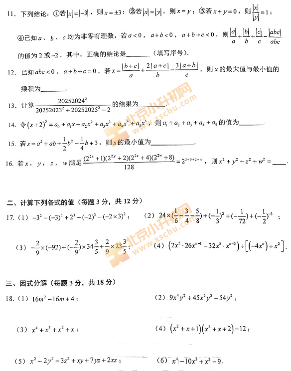 2025-2026学年第一学期十一学校初一期中数学试卷已出,满分100分,考试时间为90分钟,共三页,四道答题,22道小题,北京小升初网分享相关信息,供大家查看。