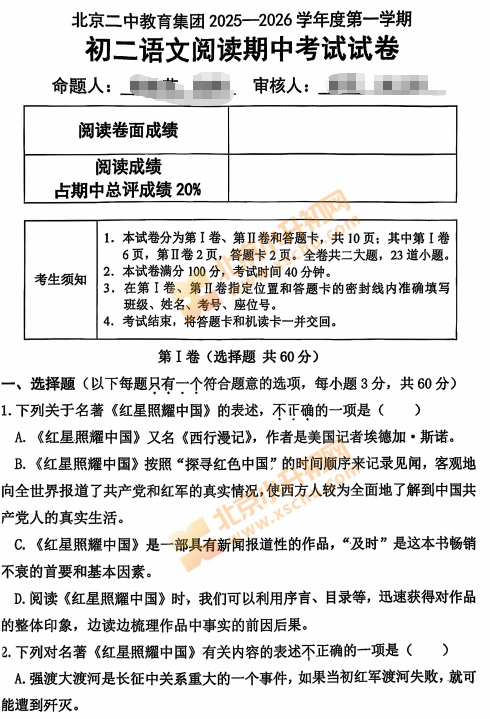 2025-2026学年第一学期北京二中初二期中语文试卷及答案什么时候出?考哪些内容?如何下载?