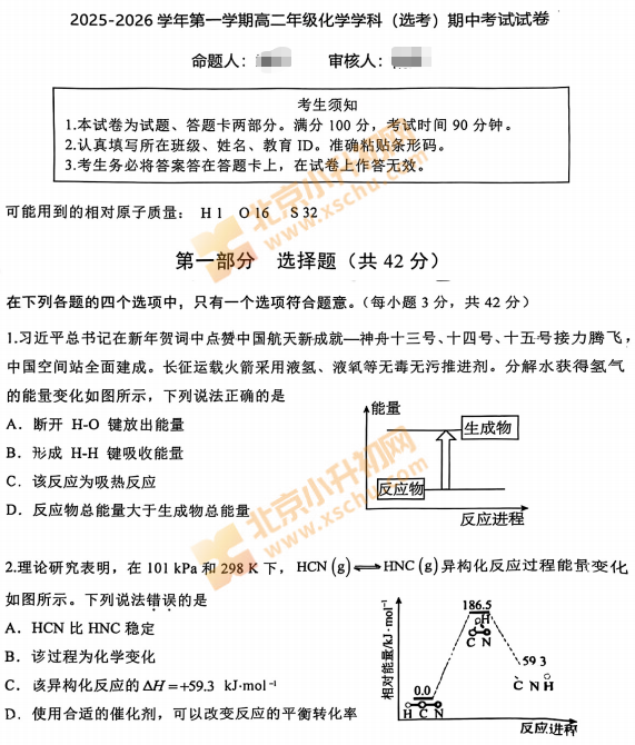 2025-2026学年第一学期北京五十中高二期中化学试卷(选考)及答案什么时候出?考哪些内容?如何下载?