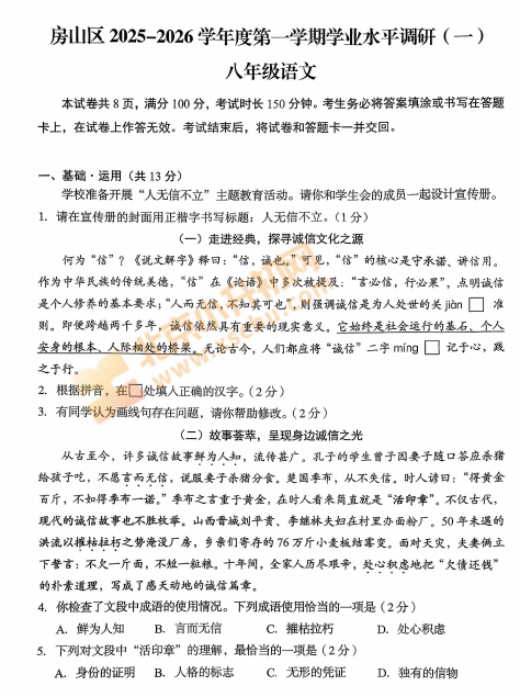 2025-2026学年(上)房山区初二期中考试语文试卷已出!文末可直接下载试卷!