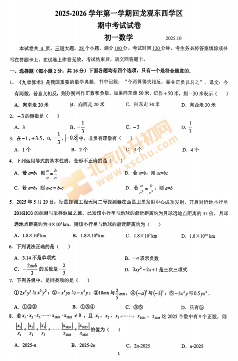 2025-2026学年(上)昌平区回龙观东西学区初一数学期中试卷已出!文末可直接下载试卷!