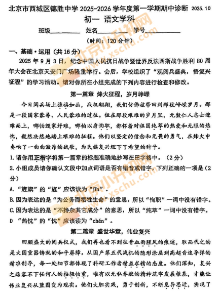 2025-2026学年(上)西城区德胜中学初一语文期中试卷已出!文末可直接下载试卷!