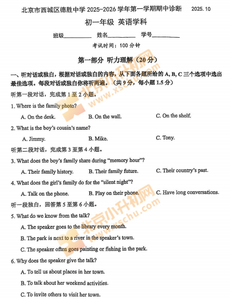 2025-2026学年第一学期西城区德胜中学初一英语期中试卷及答案什么时候出?考哪些内容?如何下载?