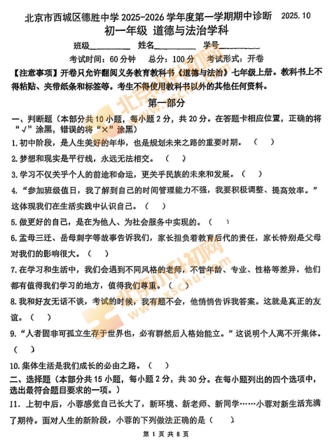 2025-2026学年(上)西城区德胜中学初一道德与法治期中试卷已出!文末可直接下载完整版试卷!