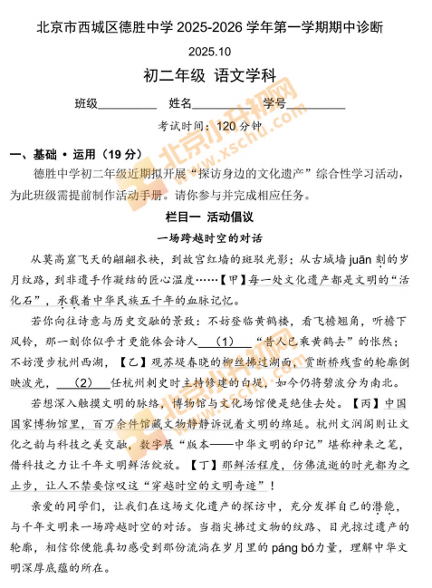 2025-2026学年第一学期西城区德胜中学初二语文期中试卷及答案什么时候出?考哪些内容?如何下载?