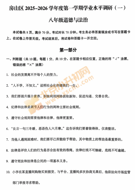 2025-2026学年第一学期房山区初二道德与法治期中考试试卷及答案什么时候出?考哪些内容?如何下载?