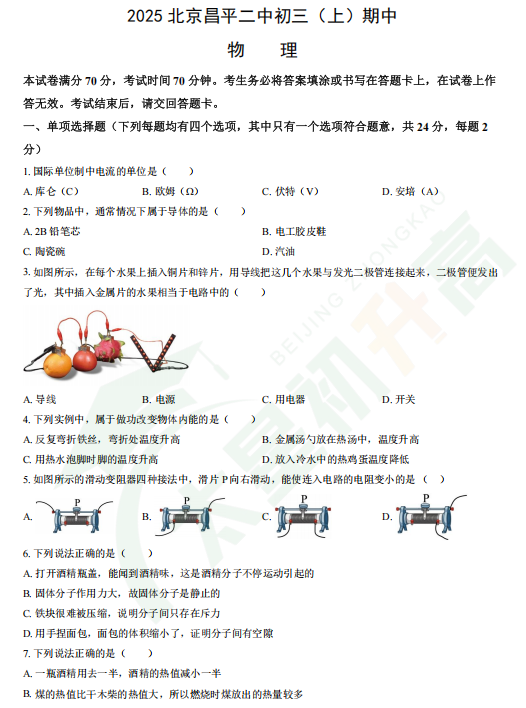 2025-2026学年第一学期北京昌平二中初三物理期中试卷及答案什么时候出?考哪些内容?如何下载?