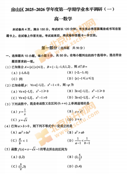 2025-2026学年第一学期北京房山区高一数学期中试卷及答案什么时候出?考哪些内容?如何下载?