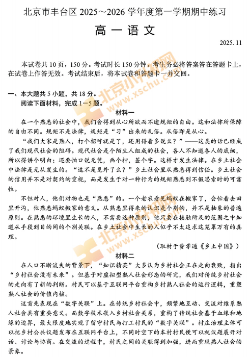 2025-2026学年第一学期北京丰台区高一语文期中试卷及答案什么时候出?考哪些内容?如何下载?