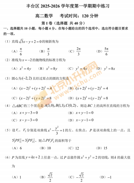2025-2026学年第一学期北京丰台区高二数学期中试卷及答案什么时候出?考哪些内容?如何下载?