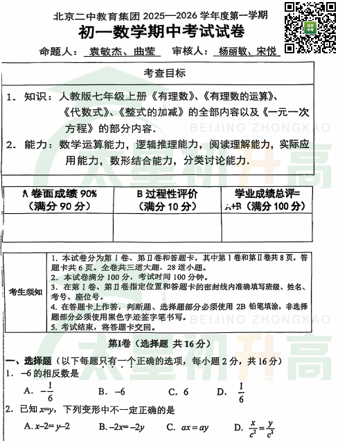 2025-2026学年第一学期北京二中初一数学期中试卷及答案什么时候出?考哪些内容?如何下载?