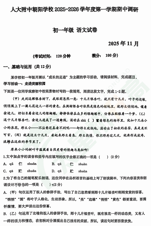 2025-2026学年第一学期人大附中朝阳学校初一期中语文试卷已出,满分100分,考试时间为120分钟,北京小升初网分享相关信息,供大家查看。