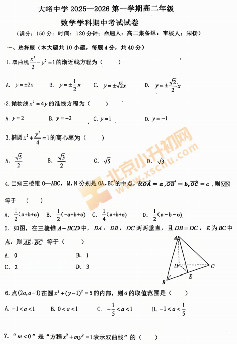 2025-2026学年第一学期门头沟大峪中学高二数学期中试卷及答案什么时候出?考哪些内容?如何下载?