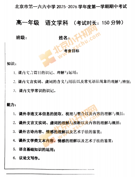 2025-2026学年第一学期东城区一六六中学高一数学期中试卷及答案什么时候出?考哪些内容?如何下载?