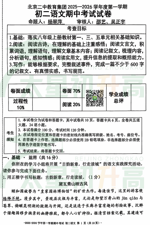 2025-2026学年第一学期北京二中初二语文期中试卷及答案什么时候出?考哪些内容?如何下载?