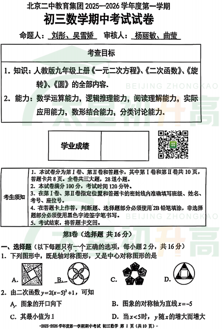2025-2026学年第一学期北京二中初三数学期中试卷及答案什么时候出?考哪些内容?如何下载?
