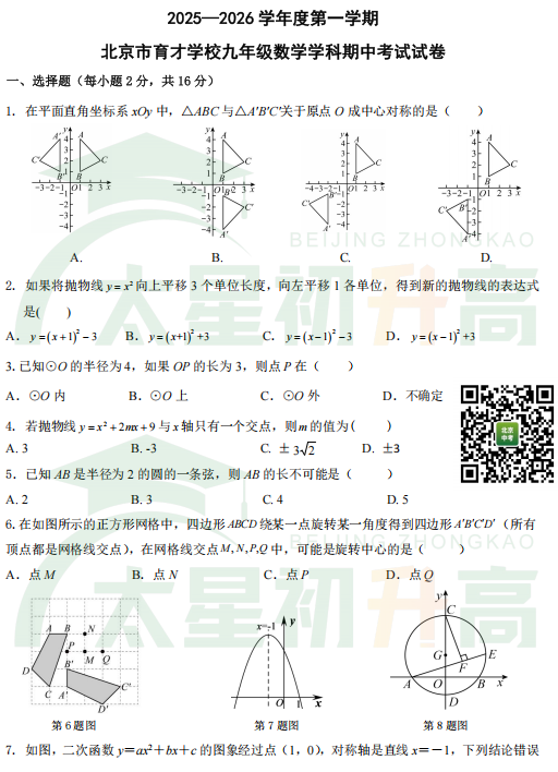 2025-2026学年(上)北京育才学校初三数学期中试卷已出!文末可直接下载试卷!