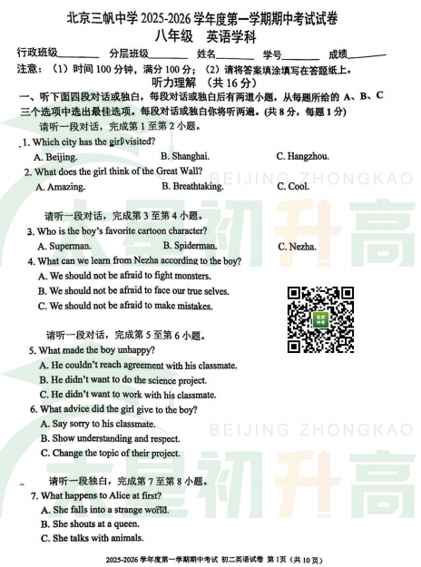 2025-2026学年(上)北京三帆中学初二英语期中试卷已出!文末可直接下载试卷!