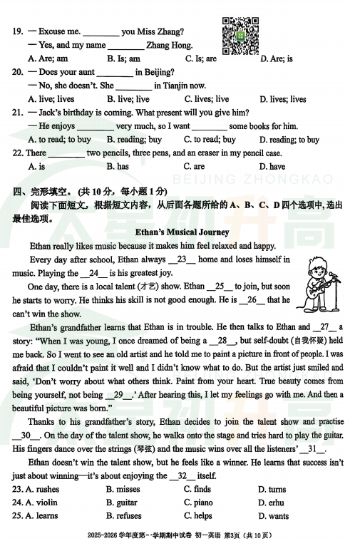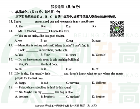 2025-2026学年(上)北京三帆中学初一英语期中试卷已出!文末可直接下载试卷!