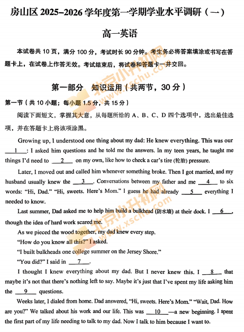 2025-2026学年第一学期北京房山区高一英语期中试卷及答案什么时候出?考哪些内容?如何下载?