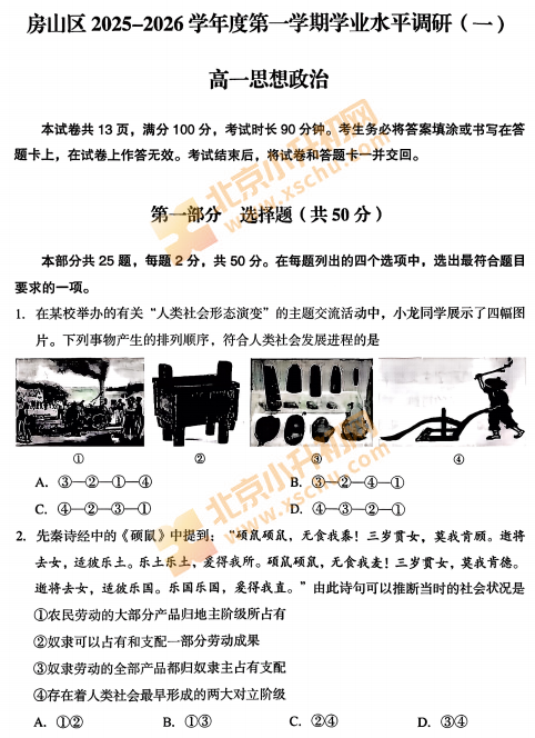 2025-2026学年第一学期北京房山区高一政治期中试卷及答案什么时候出?考哪些内容?如何下载?