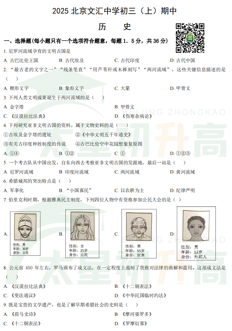 2025-2026学年第一学期东城区文汇中学初三历史期中试卷及答案什么时候出?考哪些内容?如何下载?