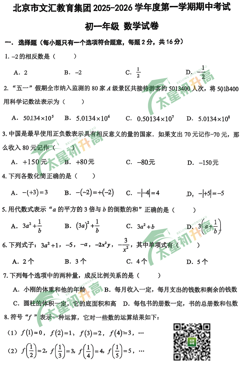 2025-2026学年(上)东城区文汇中学初一数学期中试卷已出!文末可直接下载试卷!