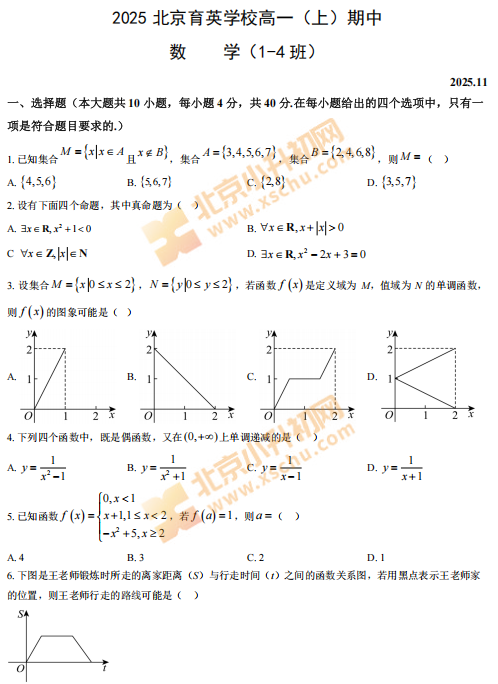 2025-2026学年第一学期北京育英学校高一数学期中试卷及答案什么时候出?考哪些内容?如何下载?