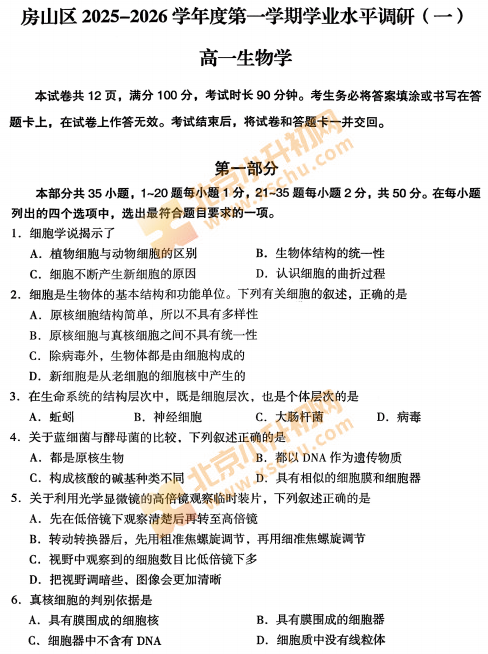 2025-2026学年第一学期房山高一生物期中试卷及答案什么时候出?考哪些内容?如何下载?