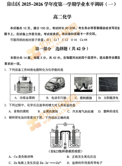 2025-2026学年第一学期房山高二化学期中试卷及答案什么时候出?考哪些内容?如何下载?