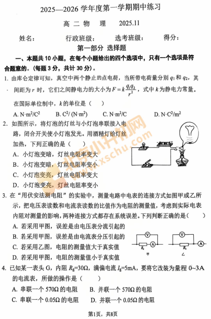 2025-2026学年第一学期北师大二附中高二物理期中试卷及答案什么时候出?考哪些内容?如何下载?