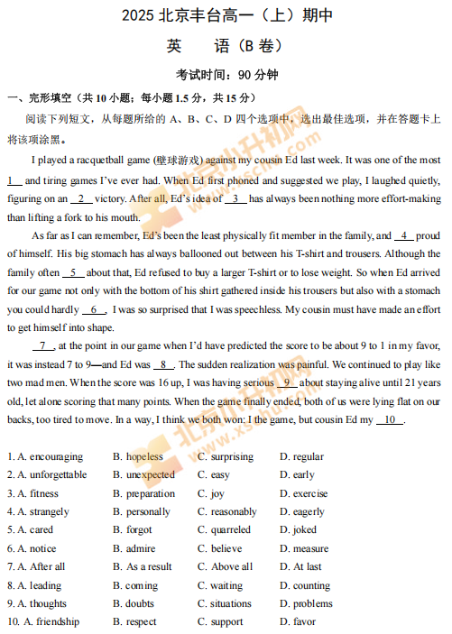2025-2026学年第一学期北京丰台区高一英语期中试卷(B卷)