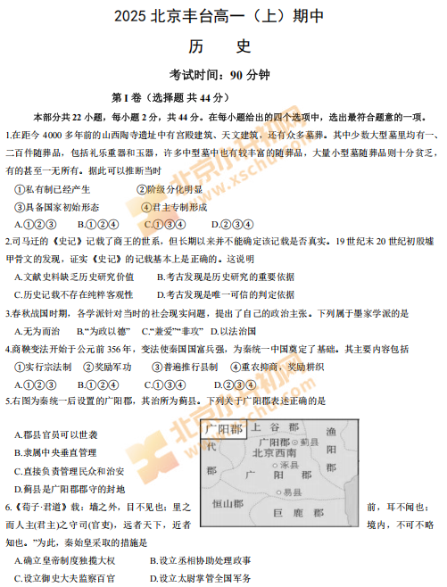 2025-2026学年第一学期北京丰台区高一历史期中试卷及答案什么时候出?考哪些内容?如何下载?