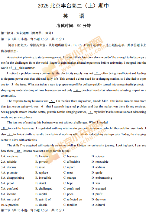 2025-2026学年第一学期北京丰台区高二英语期中试卷(A卷)