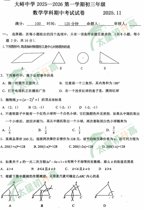 2025-2026学年第一学期大峪中学初三数学期中试卷及答案什么时候出?考哪些内容?如何下载?