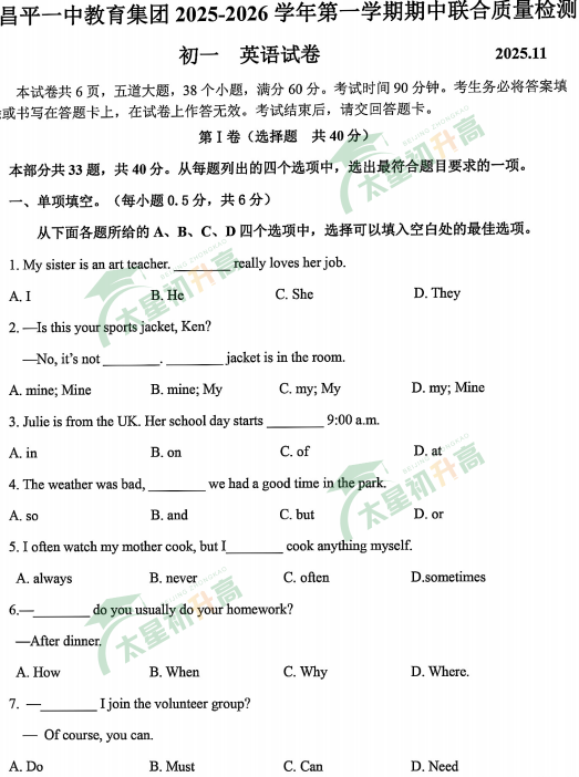 2025-2026学年(上)昌平一中初一英语期中试卷已出!文末可直接下载试卷!