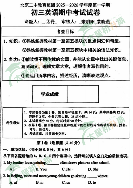 2025-2026学年第一学期北京二中初三英语期中试卷及答案什么时候出?考哪些内容?如何下载?