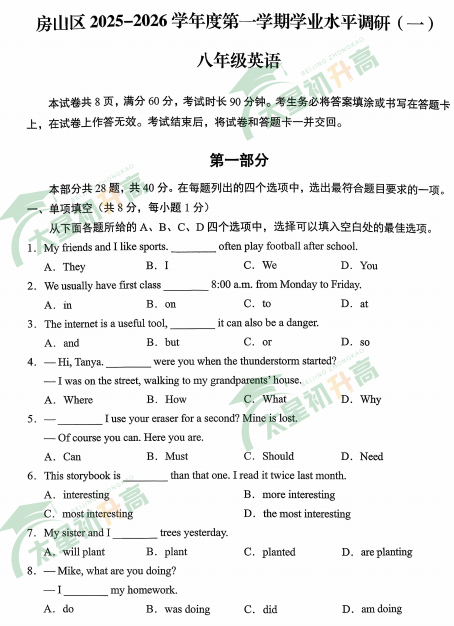 2025-2026学年第一学期房山区初二英语期中试卷及答案什么时候出?考哪些内容?如何下载?