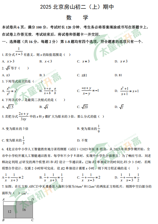 2025-2026学年(上)房山区初二数学期中试卷已出!文末可直接下载试卷!
