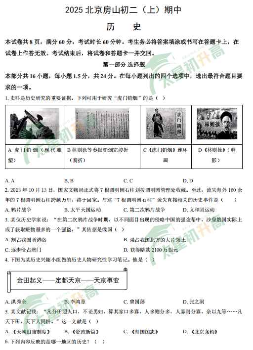2025-2026学年第一学期房山区初二历史期中试卷及答案什么时候出?考哪些内容?如何下载?