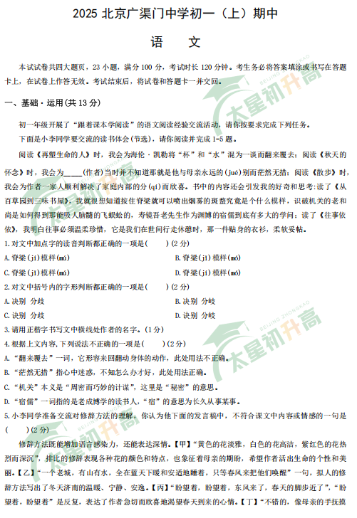 2025-2026学年(上)广渠门中学初一语文期中试卷已出!文末可直接下载试卷!