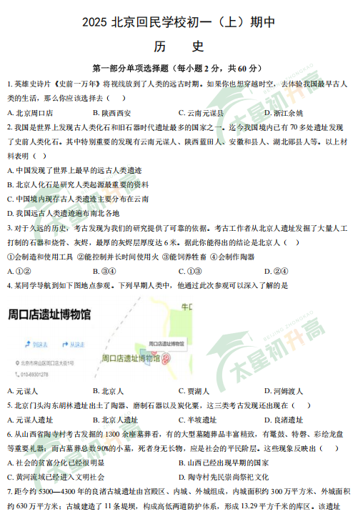 2025-2026学年第一学期北京回民学校初一历史期中试卷及答案什么时候出?考哪些内容?如何下载?