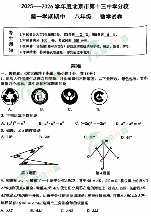 2025-2026学年第一学期北京十三中分校初二数学期中试卷及答案什么时候出?考哪些内容?如何下载?