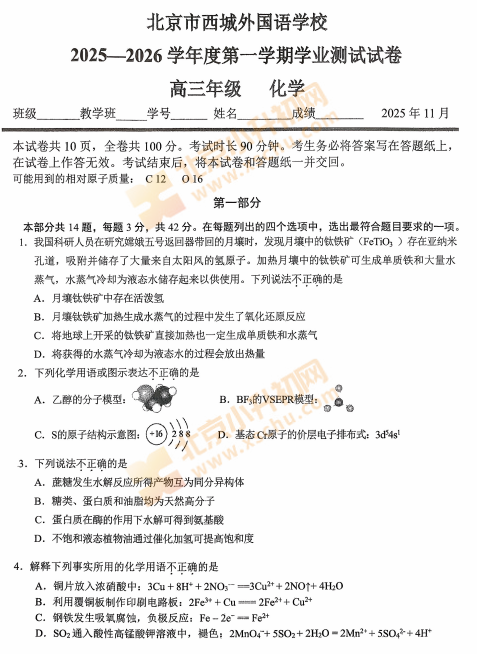 2025-2026学年第一学期北京西城外国语学校高三化学期中试卷及答案什么时候出?考哪些内容?如何下载?