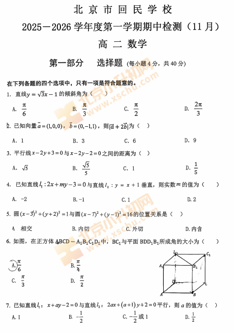2025-2026学年第一学期北京回民学校高二数学期中试卷及答案什么时候出?考哪些内容?如何下载?