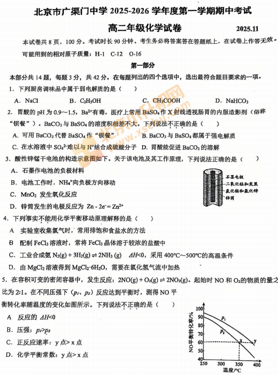 2025-2026学年第一学期东城区广渠门中学高二化学期中试卷