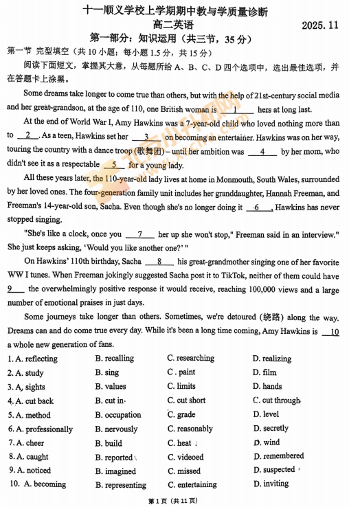 2025-2026学年第一学期十一顺义学校高二英语期中试卷