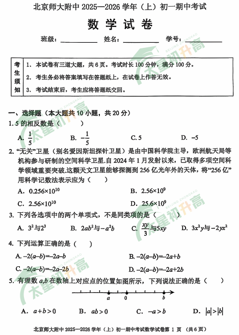 2025-2026学年第一学期北师大附中初一数学期中试卷及答案什么时候出?考哪些内容?如何下载?