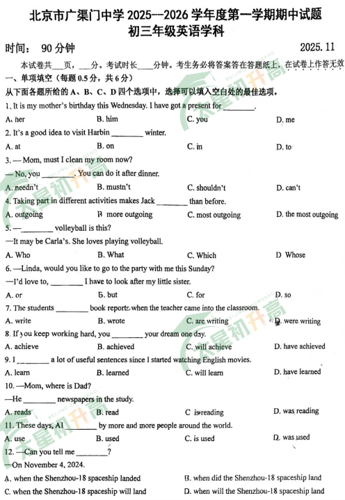 2025-2026学年(上)广渠门中学初三英语期中试卷已出!文末可直接下载试卷!