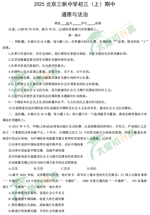 2025-2026学年第一学期北京三帆中学初三期中考试道德与法治试卷及答案什么时候出?考哪些内容?如何下载?